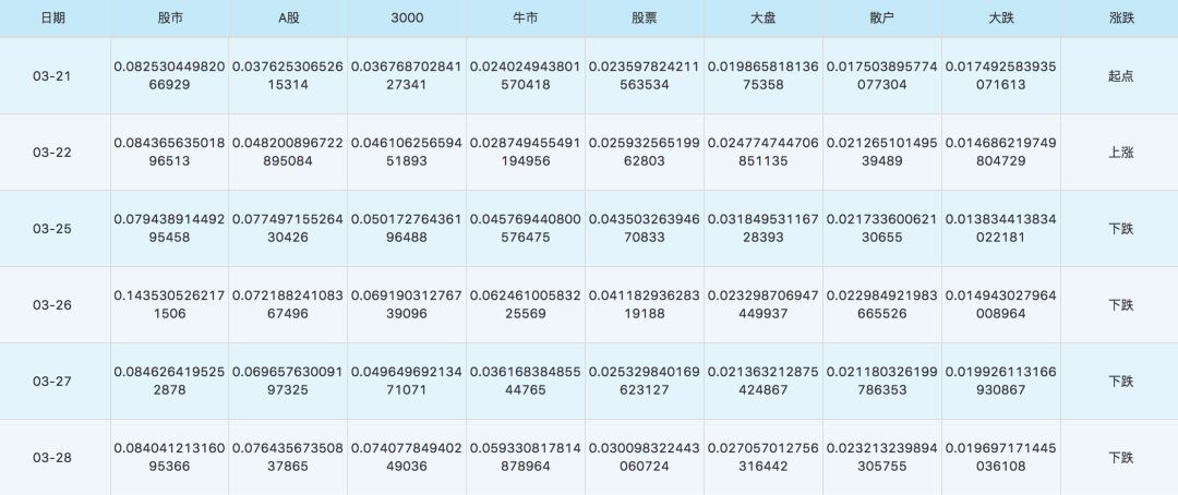■ 热词频率,这里主要是找出百度热搜、微博热搜、百度股票出现的热词的频率,可以反映市场对股市的关注度;
