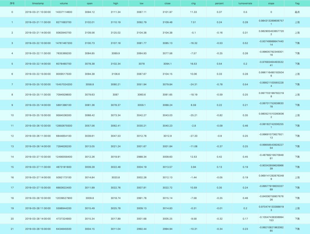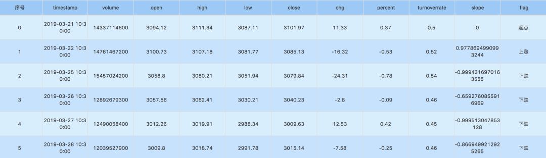 ■ 找出股市波动大的时段,这里通过用斜率判断的方法:斜率越大,说明该时段大盘波动越大;这里主要想找出该时段热词出现的频率和大盘波动的关系;