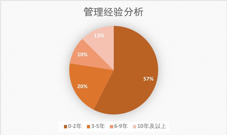 从图表显示,0~2年管理经验的人数占了一半以上的比例,总体来说,拥有一些管理经验但是还不成熟的管理者更加期望能够到德拓大学学习,而德拓大学也愿意给这部分小伙伴学习的机会;其他几个阶段的人数比较均衡,维持在4~8人之间,也希望缺乏管理经验的学员和已经拥有丰富管理经验的学员能够积极交流,对于管理经验不足的人来说,在交流中更好地成长;对于已经拥有丰富经验的学员来说,或许能够在交流中获得新的灵感或启发。