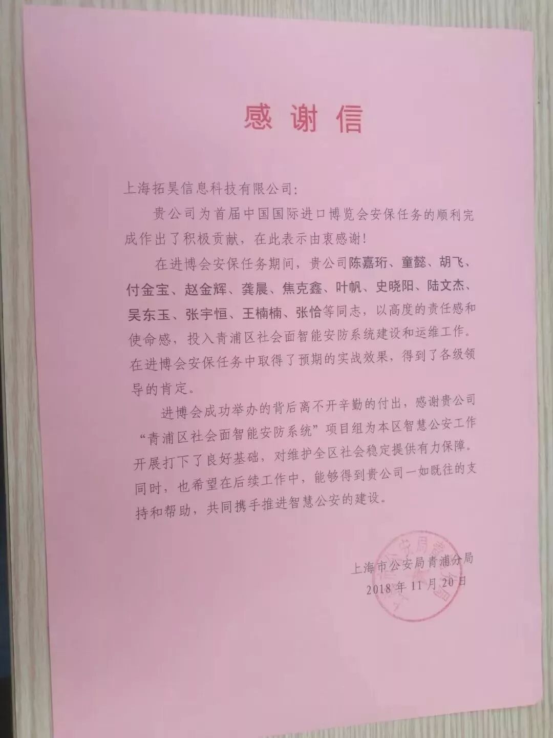 进博会结束后,我们收到了来自上海市公安局青浦分局的感谢信,让我们信心倍增,这是对我们的重要认可。
