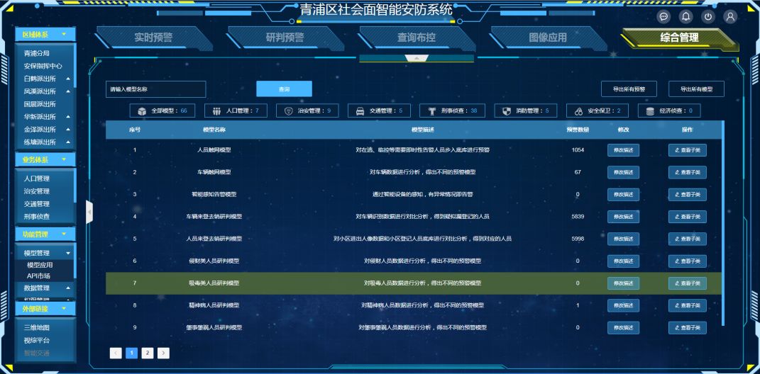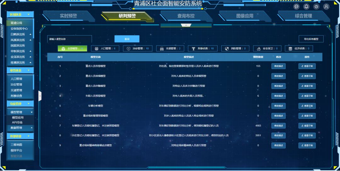 在模型应用上,我们能看到系统已有模型基础情况,包括模型的规则描述、该模型产生的预警数量;同时也有我们后续将提供给用户的针对模型的增删改查功能,以实现民警能够定制化的设计模型,充分满足不同警种根据实际情况对系统的需求。