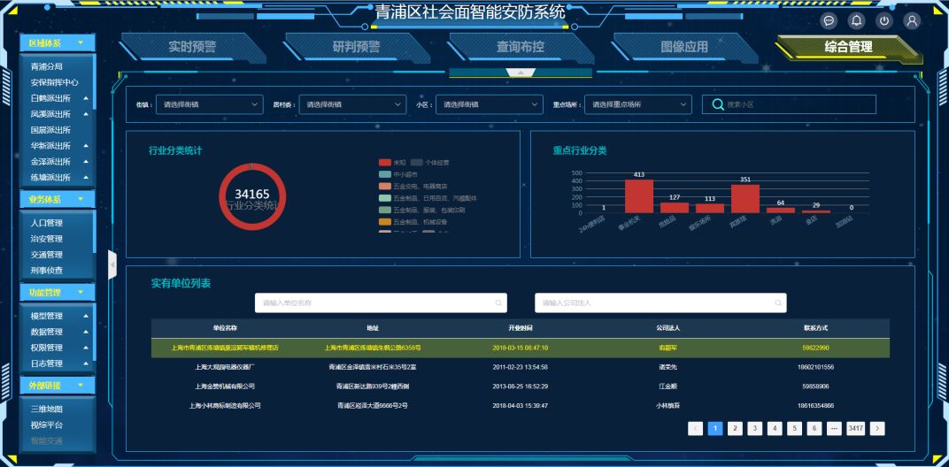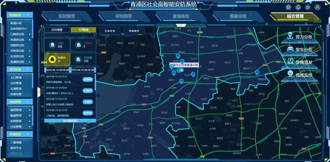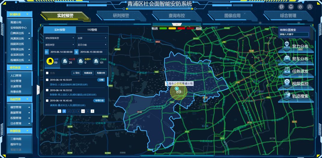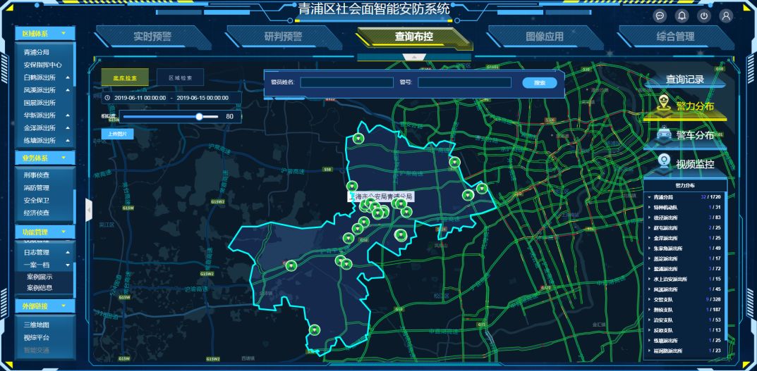 社会面智能安防系统作为青浦区能力整理者的定位,以其操作简捷、贴近实战和快速落地的特点来服务公安实战。本系统作为面向警务流程的智能感知预警处置平台,通过链入全区539个小区全量感知数据以及2.8万路视频,为青浦全区重点人员事情预警、处置提供支撑作用。