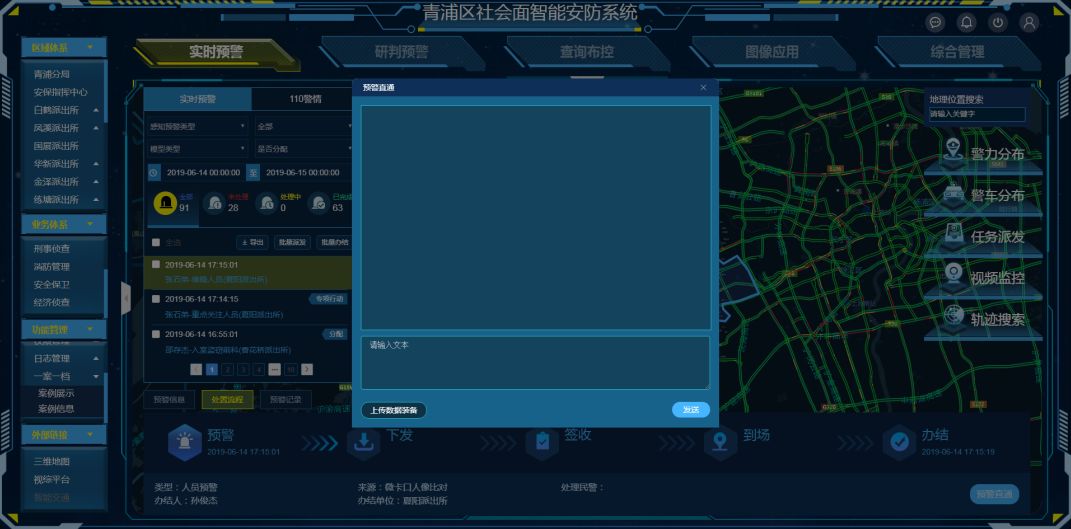 1.在实时预警模块,我们绑定了针对在逃、布控这样实时性要求比较高的预警模型,系统会进行实时抓拍各类重点人员、车辆的信息,形成预警轨迹,同时系统会自动查询出该人、车的基本信息以及相关信息库信息,当预警触发后民警可以通过任务派发的方式将预警下派至民警的「感知青浦APP」上进行处理,为了方便同一线民警的沟通,特开发了预警直通和警务直联功能,可以通过手机端进行回传视频、图片、文字等信息。