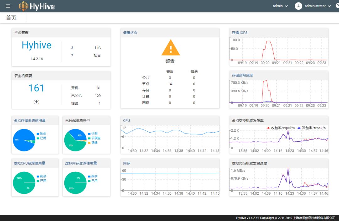 管理平台可统一纳管HyHive-us极速超融合、HyHive普通节点、HyHive桌面云节点,为后续基础架构全面转型提供统一资源管理能力。