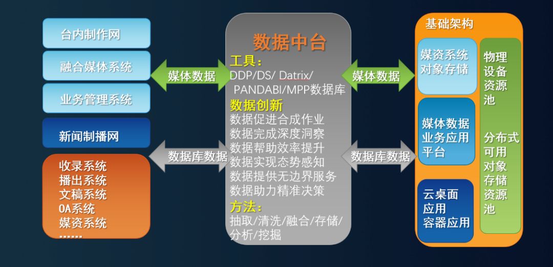 以电视台为例,媒体数据中心就是把所有与电视台相关的数据包括台内部数据、互联网外部数据统一的存储起来进行管理,极大的方便了电视台各部门对数据共享使用。