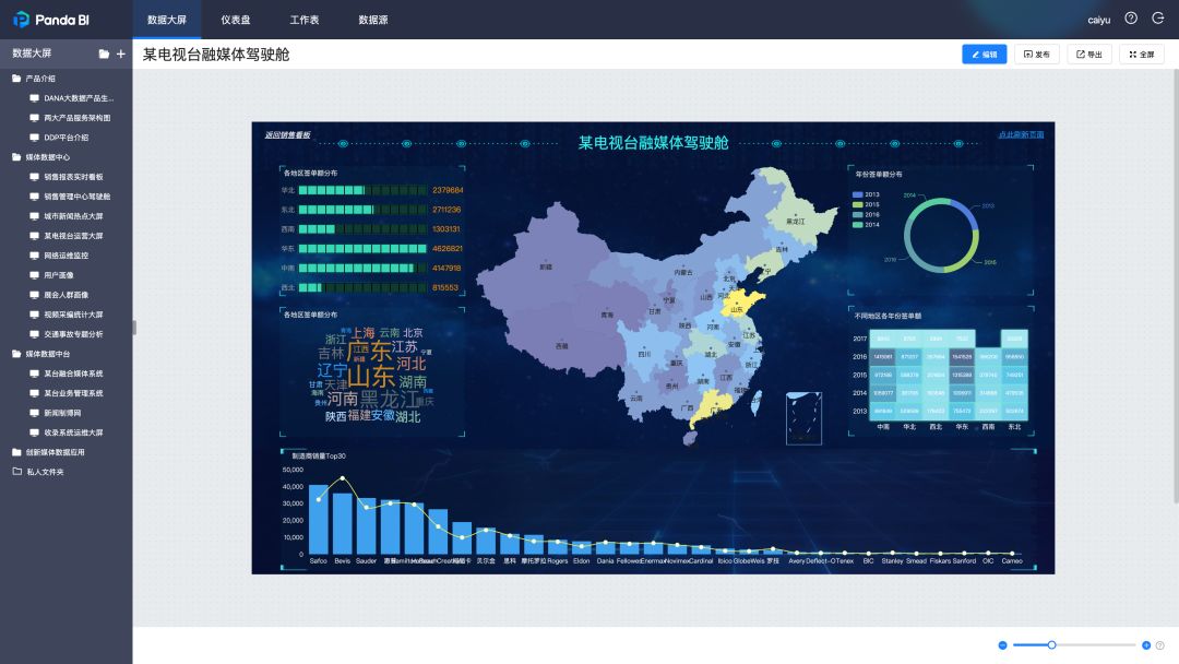德拓将广电部门这些离散数据按照一定的规律进行整合、分析并通过可视化工具平台展现出数据背后的规律,为业务的决策做理论数据指导。