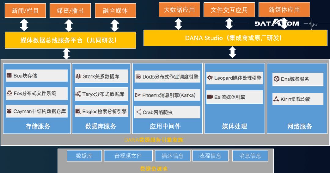 德拓的媒体数据中心负责各种数据的存放问题,媒体数据中台负责对数据的分析处理做二次打包。两者相互配合为上层应用的提供数据支撑。