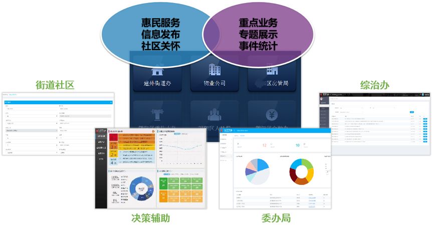 平台汇聚共享了包括公安、司法、交管、城管、消防、住建、人社等在内的23个横向单位部门,针对综治方面汇集包括微信公众号和网格员APP、综治9+X系统、“雪亮工程”资产监管系统、互联网系统等多维数据;同时对接政务数据共享交换平台及时进行共享和联动,累计近亿条数据,来共同满足各系统模块应用层面共性的基础数据需求,提供底层的各项数据支持。