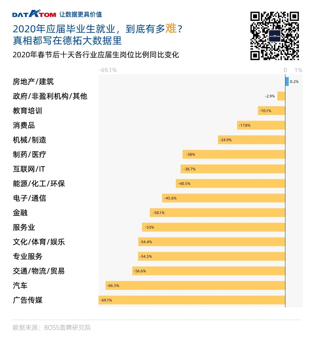 从BOSS直聘的数据来看,除房地产外,其余行业的应届生岗位数量需求大幅降低。其中,广告/传媒、汽车、金融等7个行业下降超过50%;此外,在近两年应届生关注度最高的五大行业(互联网、金融、房地产、专业服务、消费品行业)中,应届生岗位数量平均降幅达到35.7%。