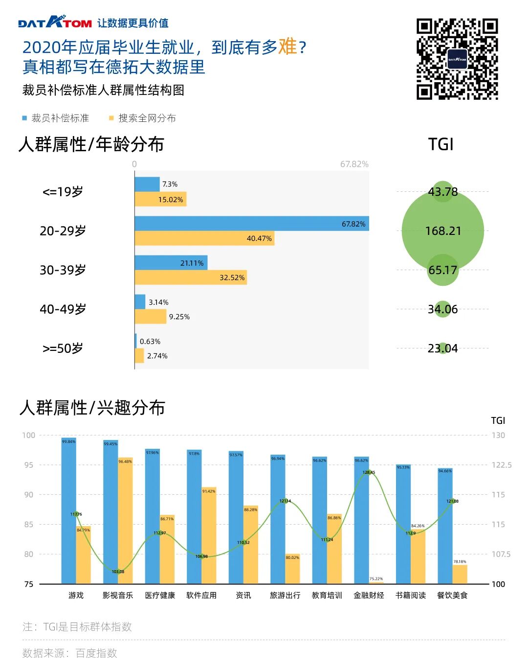 从这两项属性来看,搜索这一关键词最多的是20-29岁这一年龄段的人,他们都是很年轻且大多数人工作经验不多;从兴趣分布来看,旅游出行、餐饮美食以及金融财经对这一关键词更为关注,说明搜索该词的人大部分为年轻人,也辅证了年轻群体正在面对失业巨大压力。