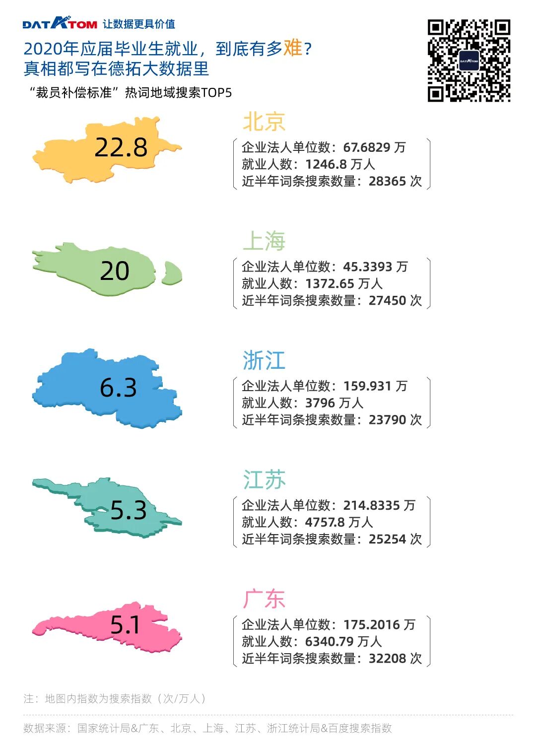 从地区来看,尽管北京和上海的企业数量和就业人数远低于三个省份,但两市的每万人搜索次数却位居前两名,搜索指数超过20,反映出中国超级城市中年轻人的就业压力更大。