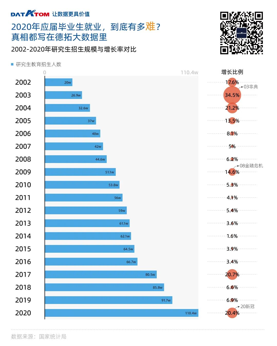 研究生招生人数从2002年的20万增加至110余万,期间有多次大幅扩招。2003年非典疫情爆发,研究生扩招,增长比例高达34.5%;2009年,受全球金融危机影响,研究生扩招,增幅达到14.6%;
