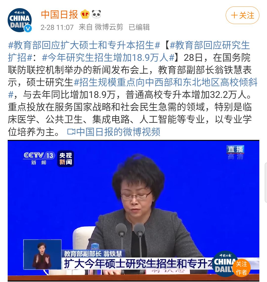 2月28日,教育部宣布2020年硕士研究生招生规模比去年增加18.9万。
