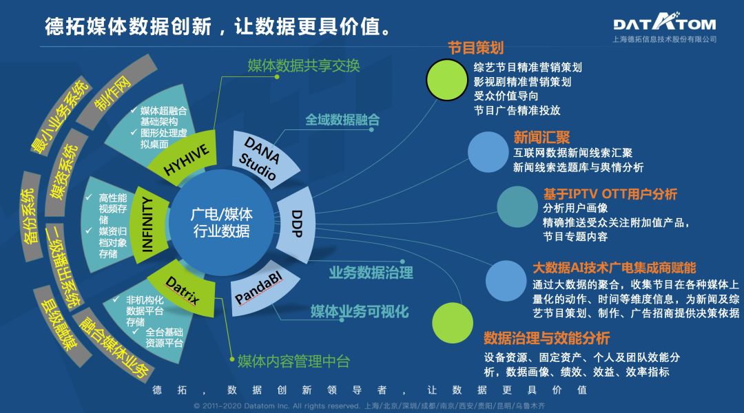 在大型媒体机构中,AI人工智能技术在音视频媒体的生产、传播、发布当中的应用价值和媒体数据价值都在逐步显现,为了进一步推动新媒体发展,德拓利用自己在数据创新领域的知识、能力、工具及数据经验,赋能媒体机构及媒体业务场景,从而最大化地发挥人工智能在媒体数据应用中的积极作用,让媒体数据更具价值。