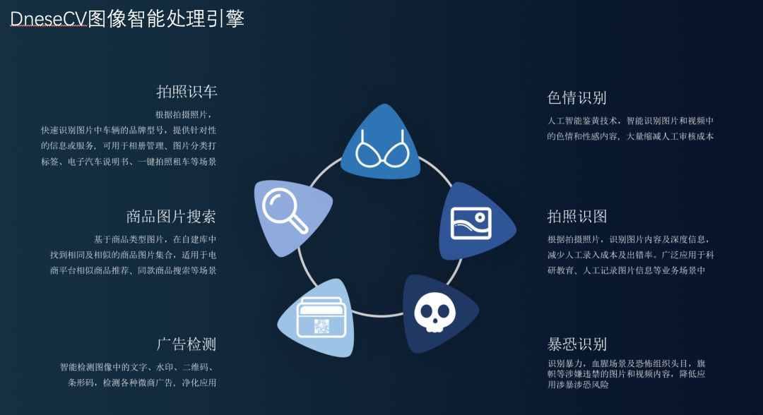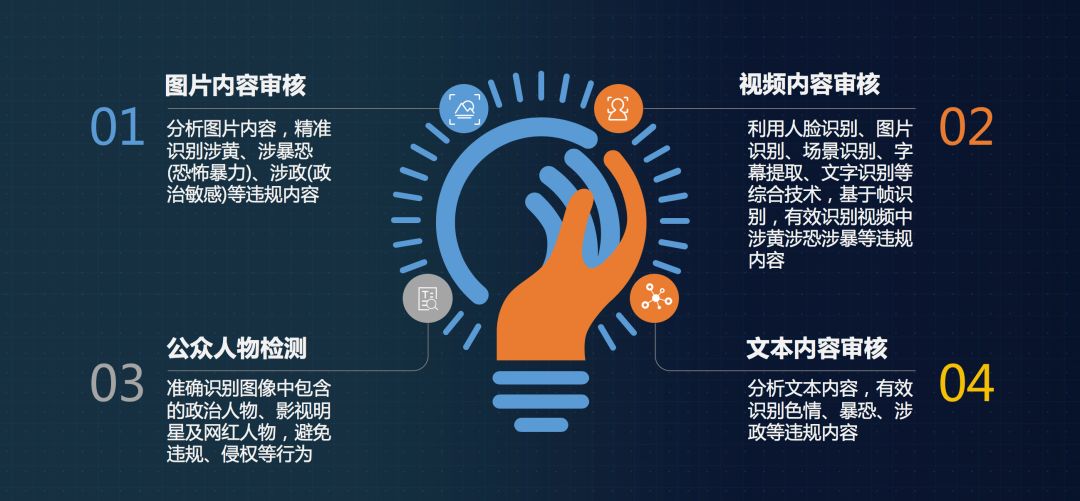 利用AI深度学习对图片、视频等媒体内容进行涉黄、涉政、涉暴恐等敏感内容审核或内容标签生成;并且能够对视频文件进行智能分析,对媒体库、内容库内容进行审核,提升视频点击率和用户体验。