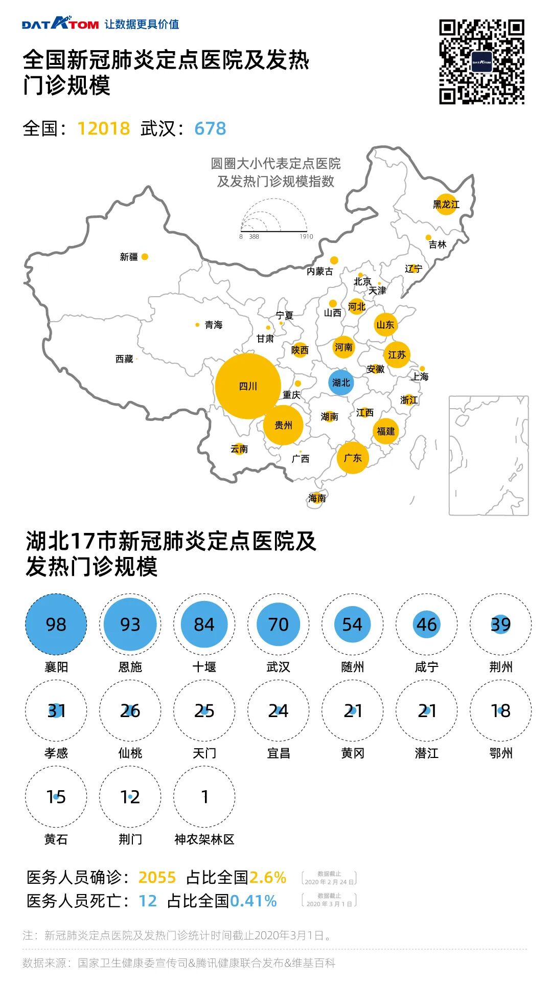 在疫情爆发后,全国各省市(包含湖北省)医院快速响应,确立定点医院对疑似及确诊新冠肺炎人数进行收治。截止目前为止,全国已有12696家定点医院。医务人员的死亡人数为12人,远少于03年SARS时医护人员死亡率占全国死亡人数的三分之一。