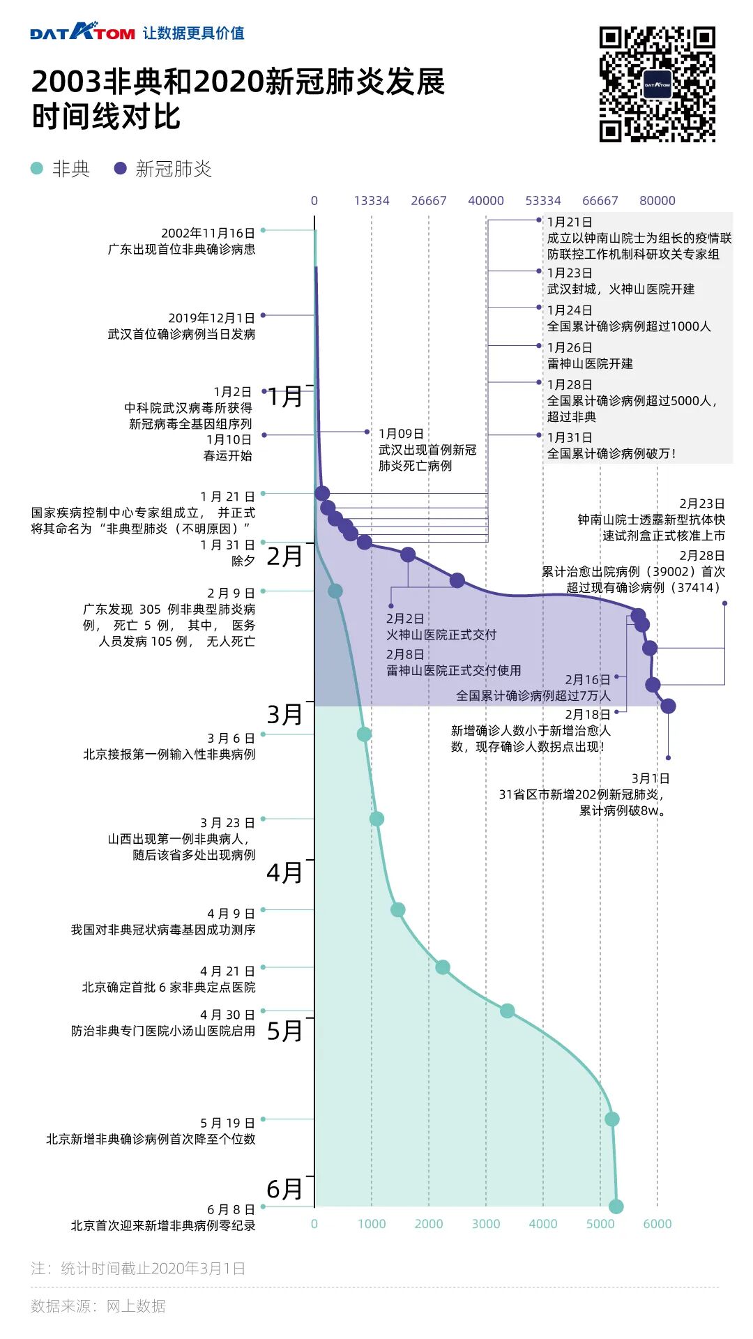 从时间上来看,新冠肺炎疫情的爆发时间周期更短,从第一例确诊到全国爆发仅为1个月的时间,呼吸衰竭病情进展更快、规模更大、传播力更强,几乎是2003年非典的14倍。但从防疫防控上来看,政府对于新冠肺炎的防控更有力,速度更快。
