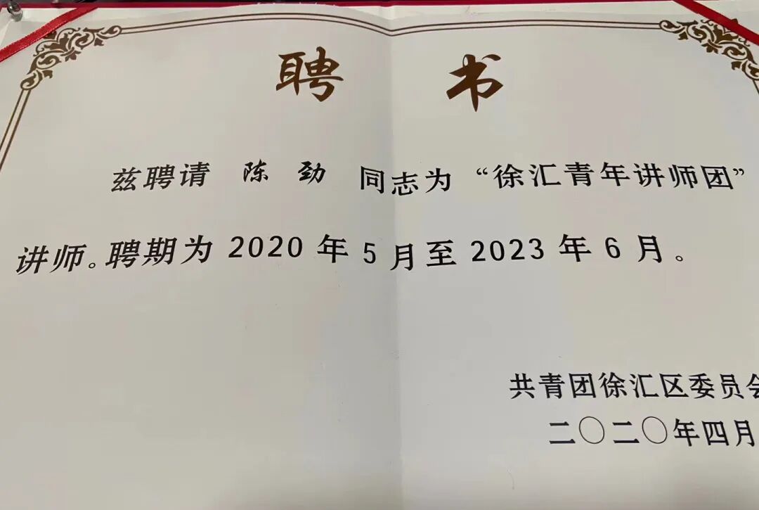 在分享结束后,共青团上海市委员会副书记邬斌,徐汇区人大常委会副主任徐国文,徐汇区副区长秦丽萍为包括陈劲在内的“徐汇青年讲师团”颁发聘书。