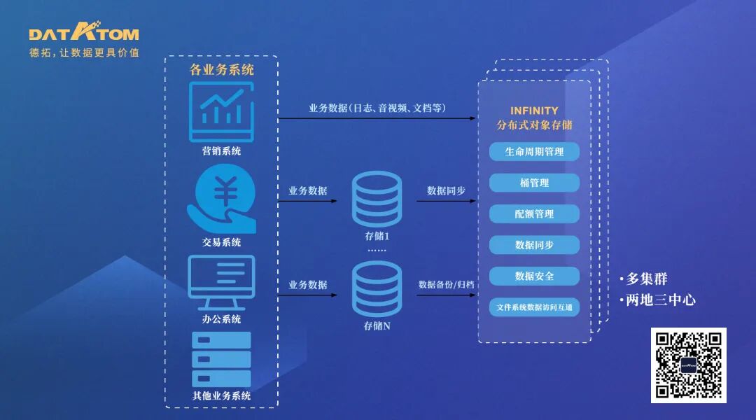 德拓INFINITY分布式对象存储拥有无单点故障、高性能、高效等优点,可以实现金融机构海量数据的融合。