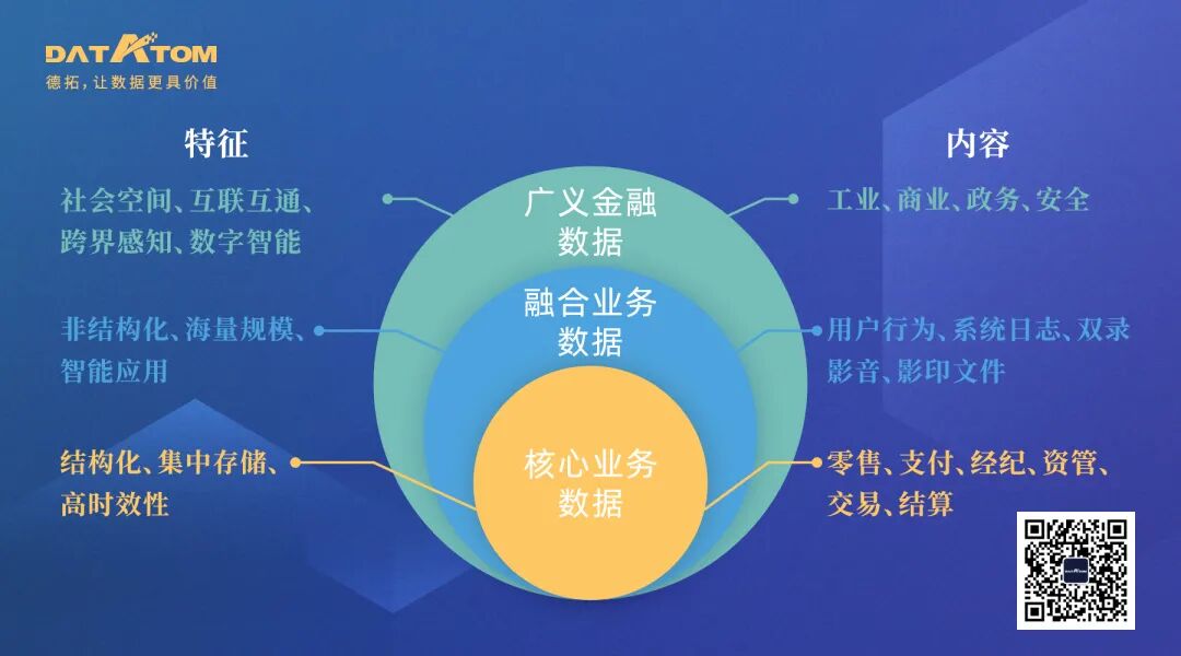 未来,随着金融与实体经济关联性的不断加深,以及智慧社会的逐步建成,金融活动必将超越金融机构本身,所有跟金融强相关的社会活动,都有可能被高度感知、高度互联、高度计算和高度数智化。金融数据的范畴也必将被延展到更为广阔的社会空间,涉及工业、商业、政务、安全等领域,逐渐形成广义金融数据。