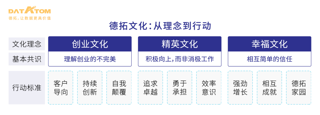 德拓给予我的深刻触动也在这里,创始人身体力行,并且用心设计文化的内容。德拓文化包括三点:创业文化、精英文化、幸福文化。对于这三点文化的具体内容,谢赟先生有专门论述(传送门:《尊重价值创造,用创业文化获得成长的力量》、《成为幸福组织,才能基业长青》、《组织的高度取决于人才的深度,打造精英文化组织》),在此我不赘述,我仅从学术和意义上启发大家对这些文化的基本认知,帮助大家更深刻地理解和感受德拓文化之于自己成长的意义,并因此在行动中更笃定、更具信心和力量,这时的德拓文化也更具价值。