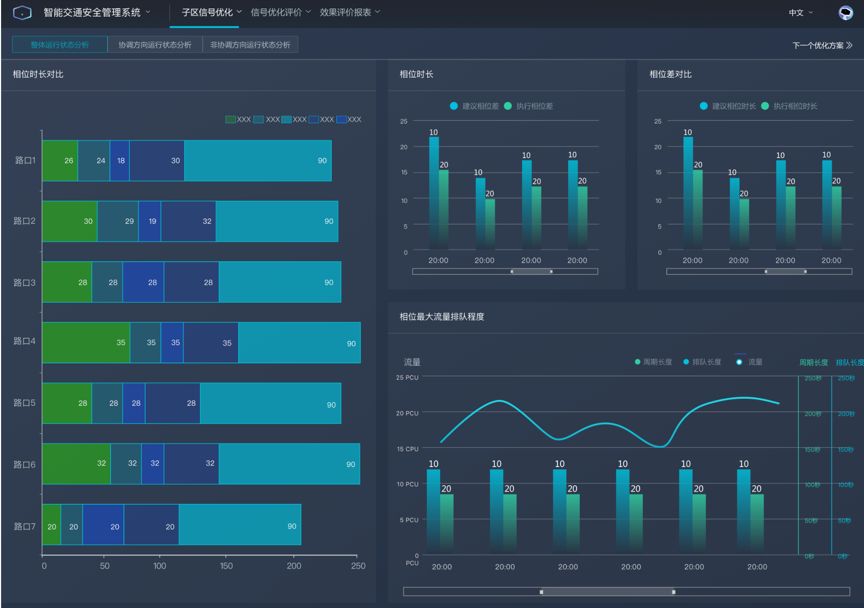 交通信号优化模块包含交通信号优化概览、单路口信号优化、子区信号优化(多路口)、交通信号优化评价等功能。